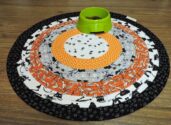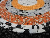 Halloween koberec Jelly-Roll v okrúhlom tvare. Môžete ho použiť ako podložku pod misku na granule pre mačičku, alebo ako dekoráciu v interiéri. Koberec je ručne šitý z bavlnenej látky vo farbách jesene s tematikou Helloween.